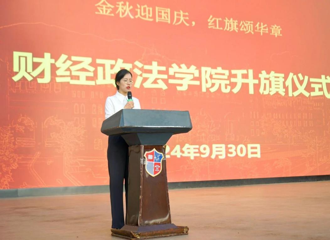 其次,由学院员工代表张怡进行国旗下发言。张怡同学在演讲中回顾了祖国的辉煌历史,展望了未来的美好前景,同时也呼吁同学们能够继续为实现中华民族伟大复兴的中国梦而不懈奋斗。